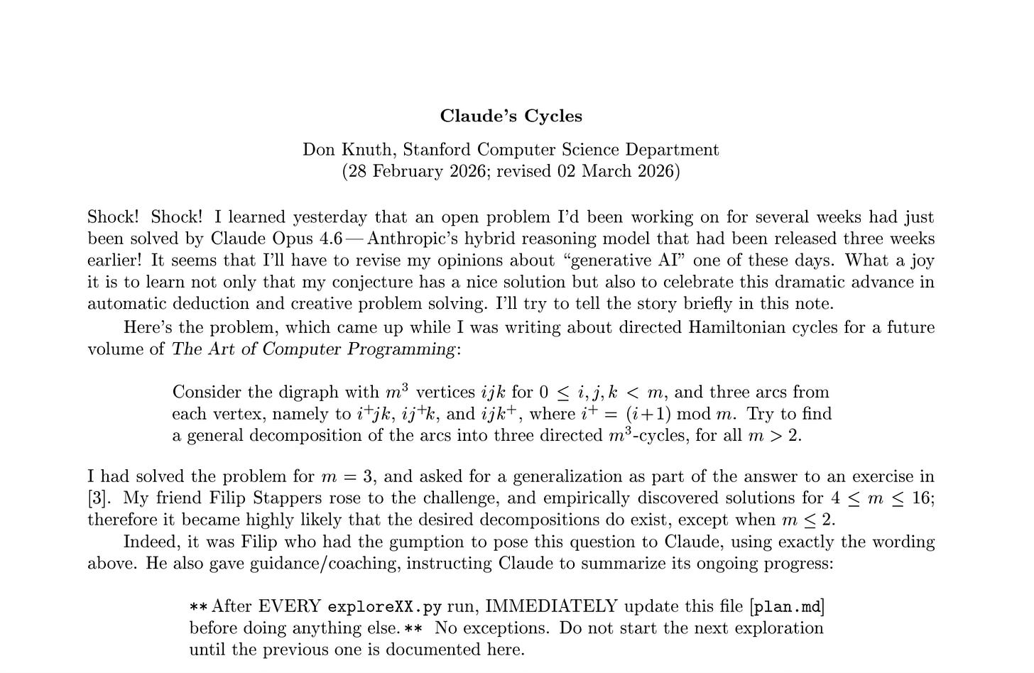 Recently, Knuth’s colleague Filip Stappers asked Claude Opus 4.6, Anthropic’s reasoning model, to investigate the problem.